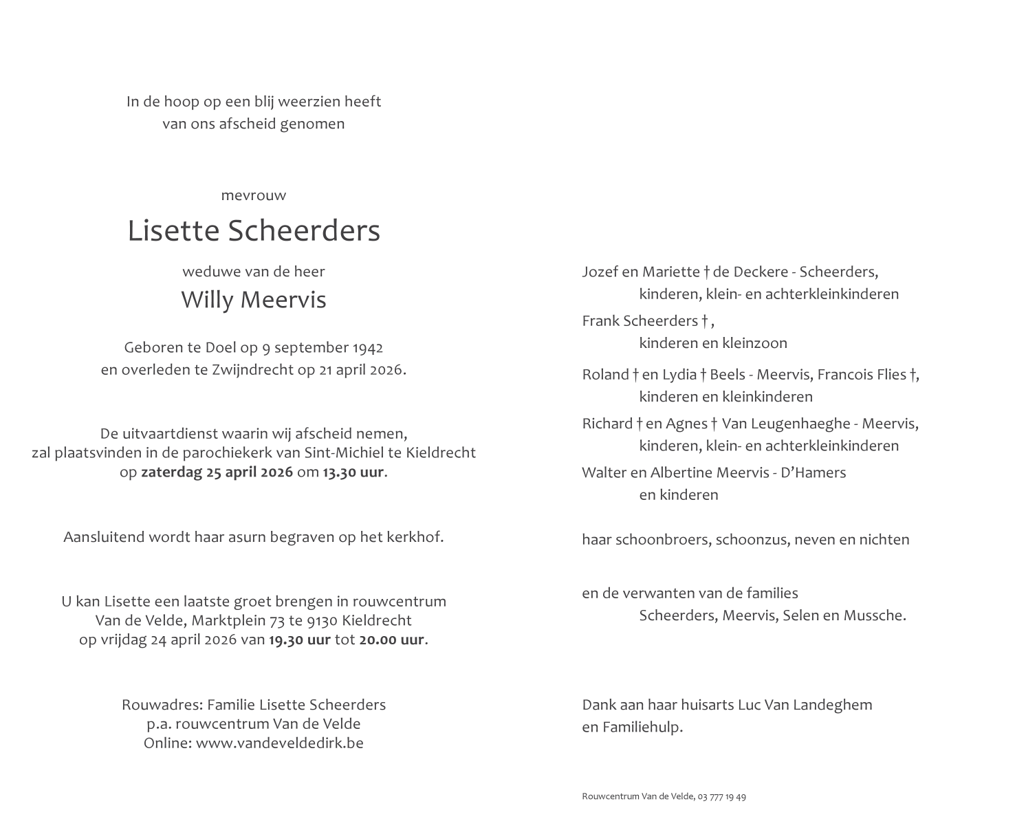 Overlijdensbericht van Mevrouw Lisette Scheerders