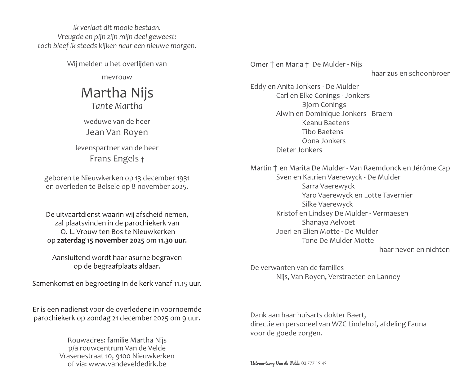 Overleden te Belsele (Sint-Niklaas) (9111) op zaterdag 8 november 2025 op 93-jarige leeftijd