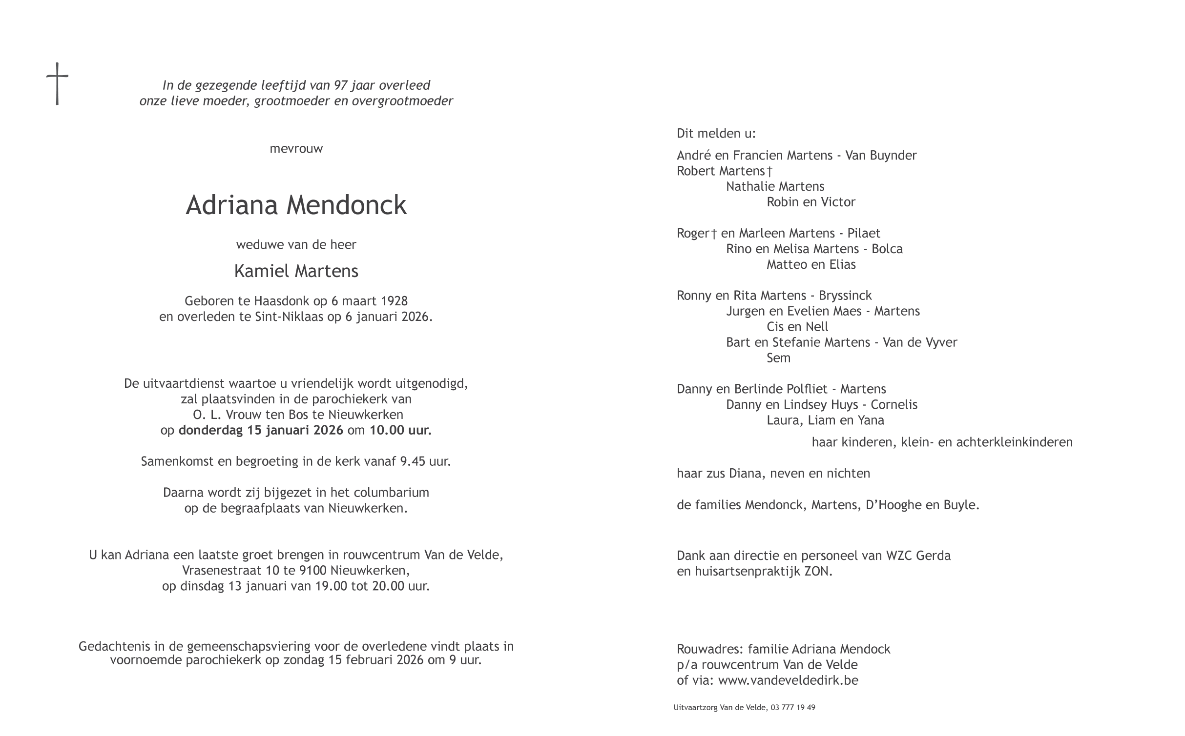 Overleden te Sint-Niklaas (9100) op dinsdag 6 januari 2026 op 97-jarige leeftijd