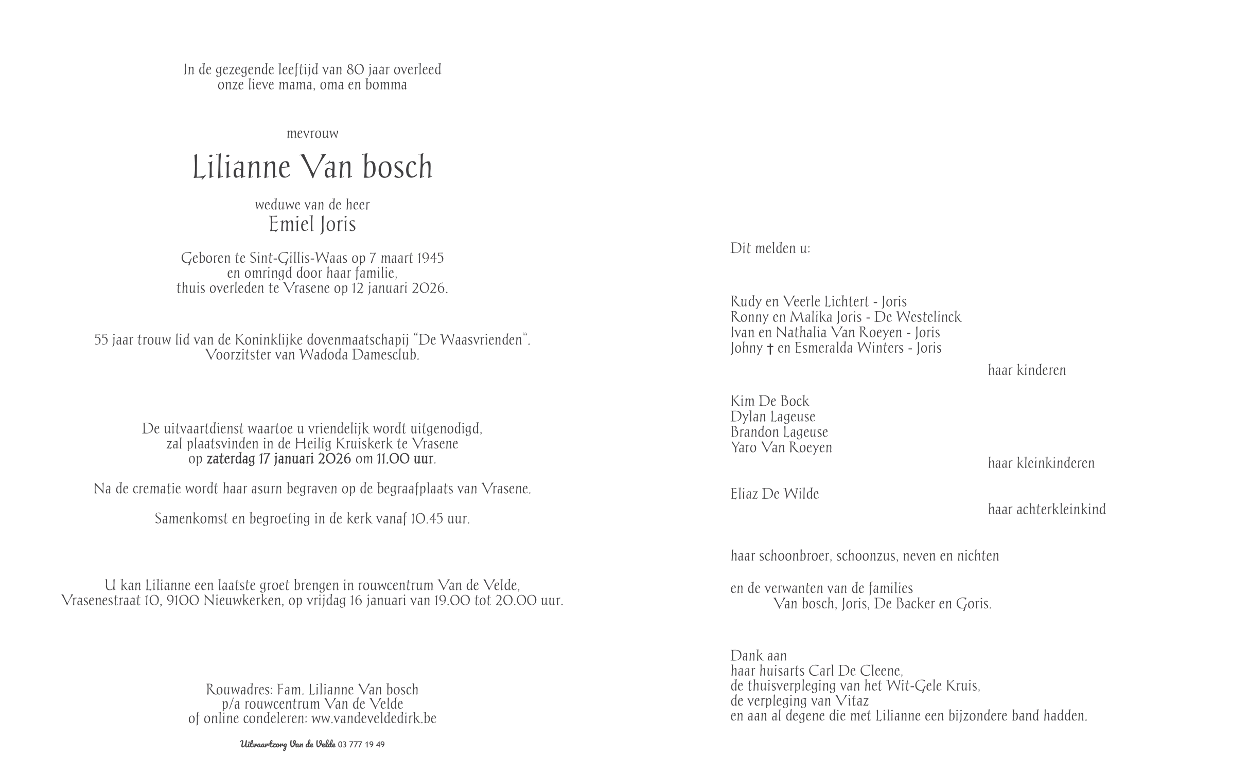 Overleden te Vrasene (9120) op maandag 12 januari 2026 op 80-jarige leeftijd