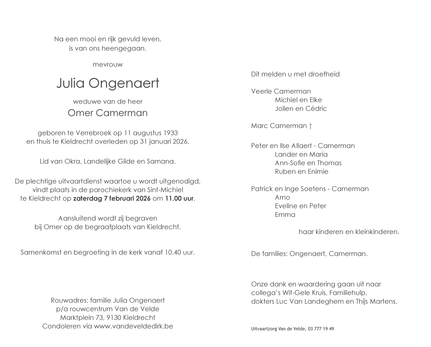 Overleden te Kieldrecht (Beveren) (9130) op zaterdag 31 januari 2026 op 92-jarige leeftijd